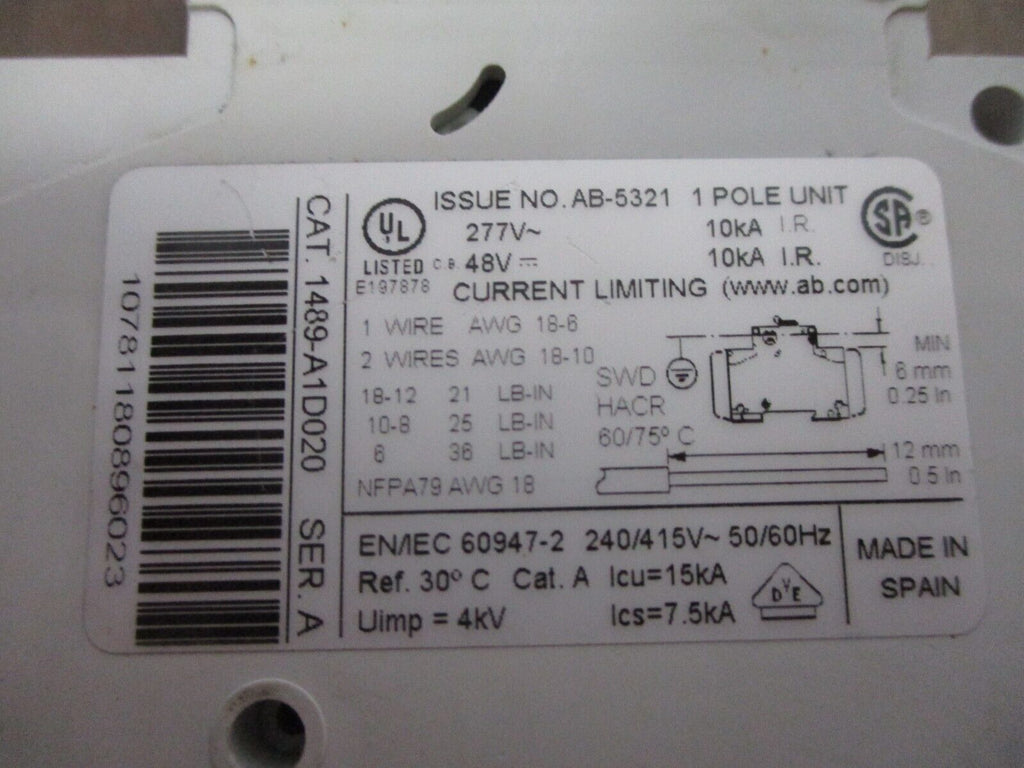 Allen-Bradley Circuit Breaker 1489-A1D020 2A 277V 1P *Lot of 2...