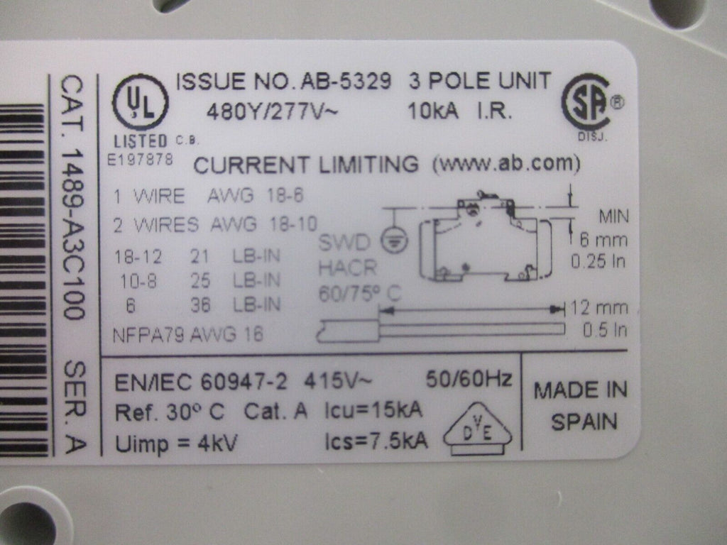 Allen-Bradley Circuit Breaker 1489-A3C100 Ser.A 10A 3P 480Y/277V New Surplus