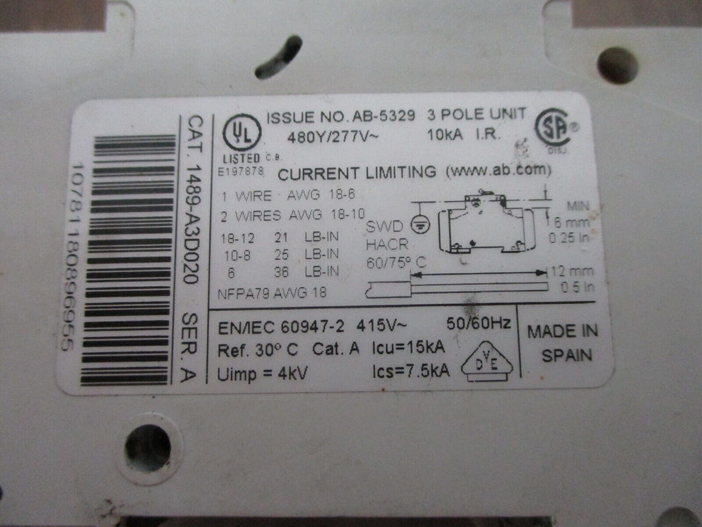 Allen-Bradley Circuit Breaker 1489-A3D020 2A 480Y/277V 3P Used Condition: UsedBrand: Allen-BradleyOperation Method: On/OffMaximum Amperage: 2 AVoltage: 480Y/277VColor: WhiteCurrent Rating: 1-15 AMPN: 1489-A3D020Number of Poles: 3 Allen-Bradley Circuit Breaker 1489-A3D020 2A 480Y/277V 3P Used Allen-Bradley Circuit Breaker Part #: 1489-A3D020 2A 480Y/277 V 3P Used Loc: 21G2-32 Allen-Bradley Circuit Breaker Part #: 1489-A3D020 2A 480Y/277 V 3P Uséd Loc: 21G2-32