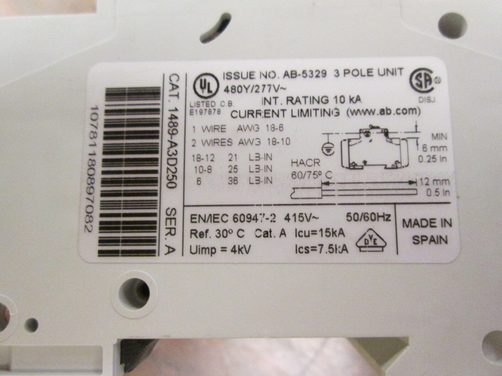 Allen-Bradley Circuit Breaker 1489-A3D250 25A 480Y/277V 3P Used Allen-Bradley Circuit Breaker Part #: 1489-A3D250 25A 480Y/277V 3P UsedLOC 12A4-26 Allen-Bradley Circuit Breaker Part #: 1489-A3D250 25A 480Y/277V 3P UsédLOC 12A4-26