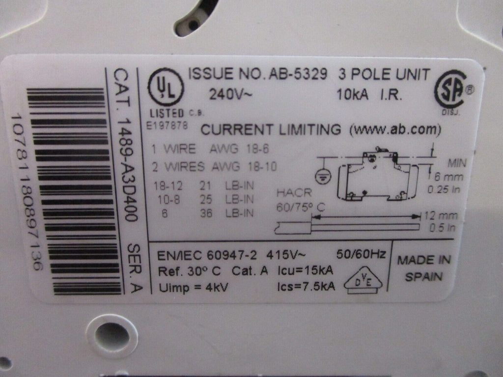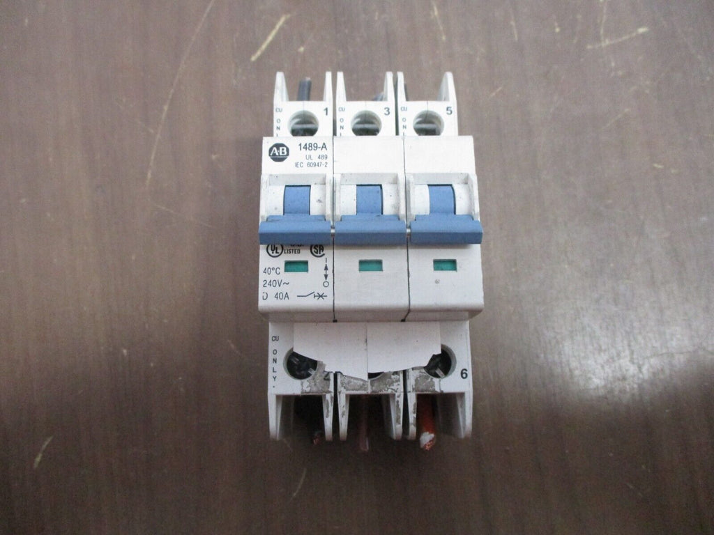 Allen-Bradley Circuit Breaker 1489-A3D400 40A 240V 3P Used Condition: UsedBrand: Allen-BradleyMaximum Amperage: 40 AVoltage: 240 VCurrent Rating: 31-40 AMPN: 1489-A3D400Number of Poles: 3 Allen-Bradley Circuit Breaker 1489-A3D400 40A 240V 3P Used Allen-Bradley Circuit Breaker Part #: 1489-A3D400 40 A 240 V 3P Used Loc: 21G2-30 Allen-Bradley Circuit Breaker Part #: 1489-A3D400 40 A 240 V 3P Uséd Loc: 21G2-30