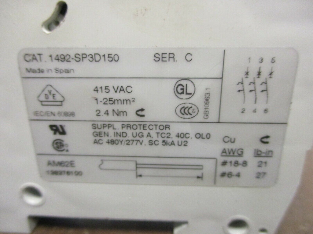 Allen-Bradley Circuit Breaker 1492-SP3D150 Ser. C 15A 480Y/277V 3P Used_x000D_ Condition: UsedMPN: 1492-SP3D150Brand: Allen-Bradley Allen-Bradley Circuit Breaker 1492-SP3D150 Ser. C 15A 480Y/277V 3P Used Allen-Bradley Circuit Breaker Part #: 1492-SP3D150 Ser. C 15A 480Y / 277V 3P UsedLOC 23F4-13 Allen-Bradley Circuit Breaker Part #: 1492-SP3D150 Ser. C 15A 480Y / 277V 3P Uséd LOC 23F4-13