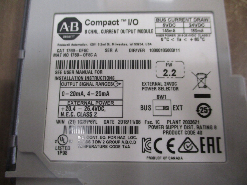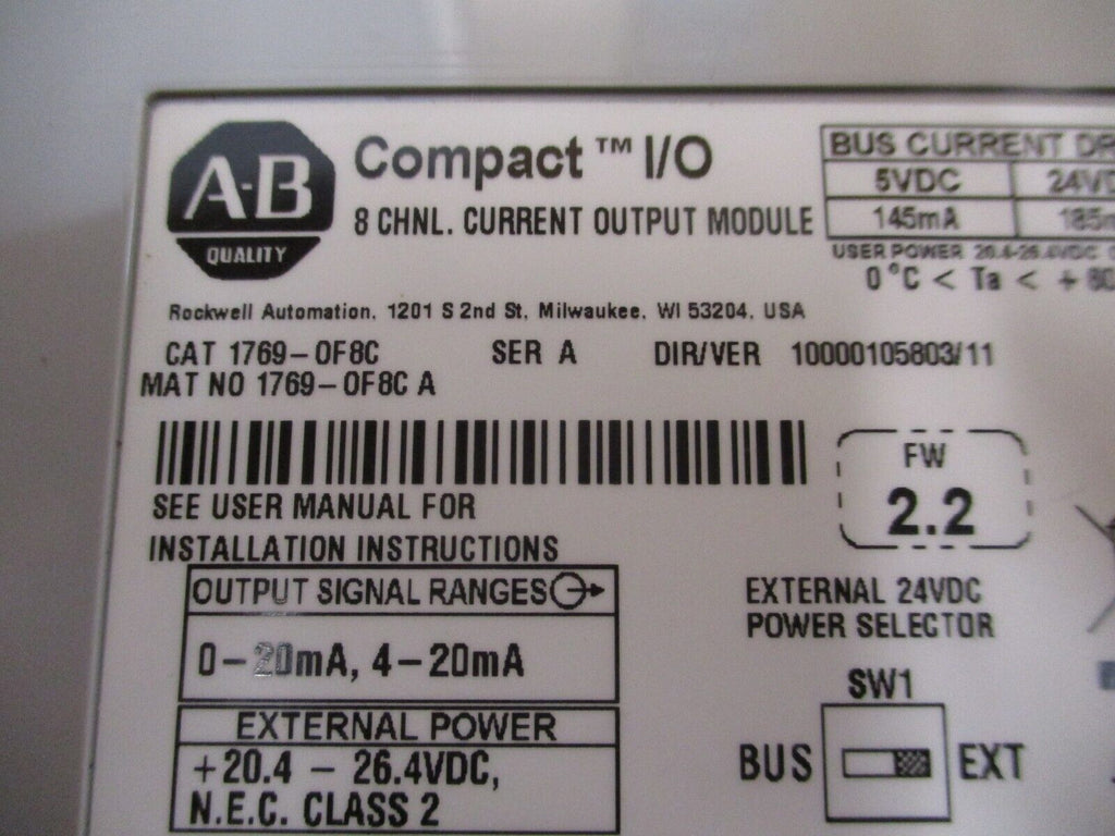 Allen-Bradley Compact I/O Current Output Module 1769-OF8C Ser. A F/W Rev. 2.2_x000D_ Condition: UsedBrand: Allen-BradleyController Platform: Compact I/OMPN: 1769-OF8CType: PLC Output Module Allen-Bradley Compact I/O Current Output Module 1769-OF8C Ser. A F/W Rev. 2.2 Allen-Bradley Compact I/O Current Output Module Part #: 1769-OF8C Ser. A F/W Rev. 2.2 8 Ch Used Loc: 27D4-22 Allen-Bradley Compact I/O Current Output Module Part #: 1769-OF8C Ser. A F/W Rev. 2.2 8 Ch Uséd Loc: 27D4-22