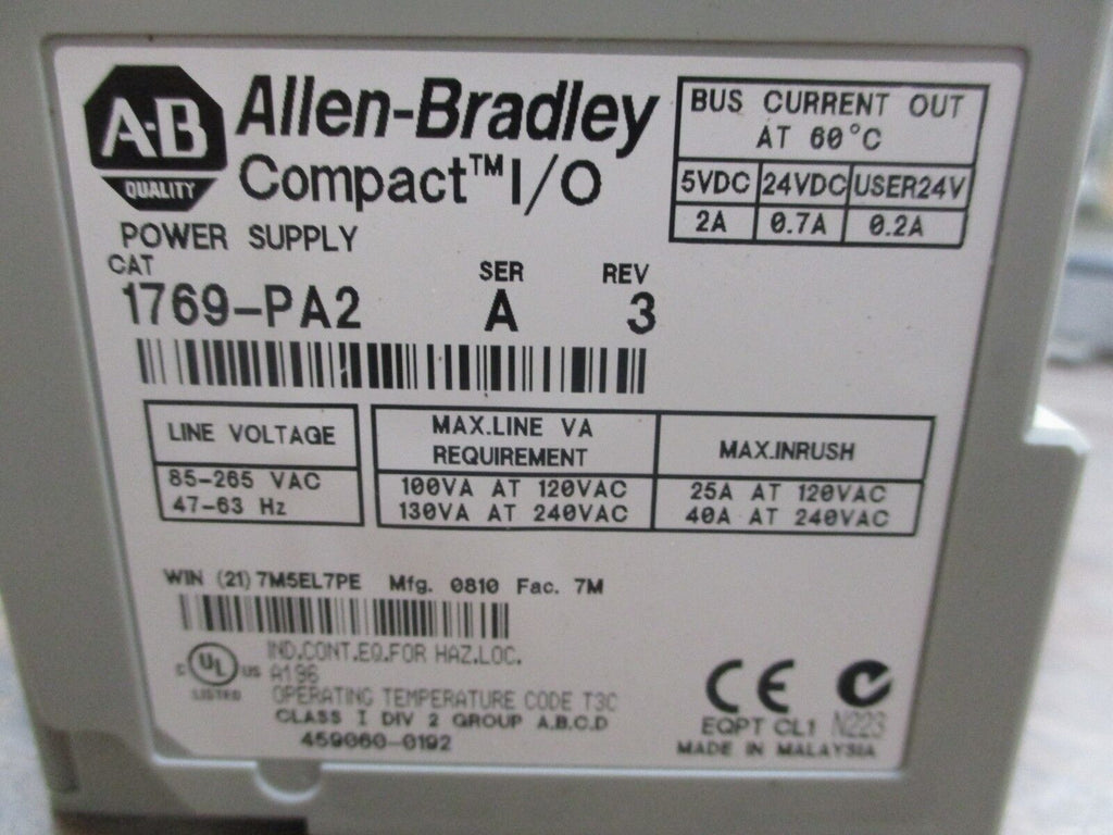 Allen-Bradley Compact I/O Power Supply Part #: 1769-PA2 Ser. A Rev. 3 Line: 85-132 / 170-205VAC 47-63Hz Out: 5VDC @ 4A / 24VDC @ 1.7A Used LOC 20H5-35