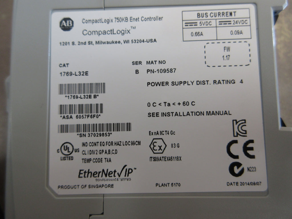 Allen-Bradley CompactLogix 750KB Enet Controller 1769-L32E Ser. B F/W: 1.17 Used