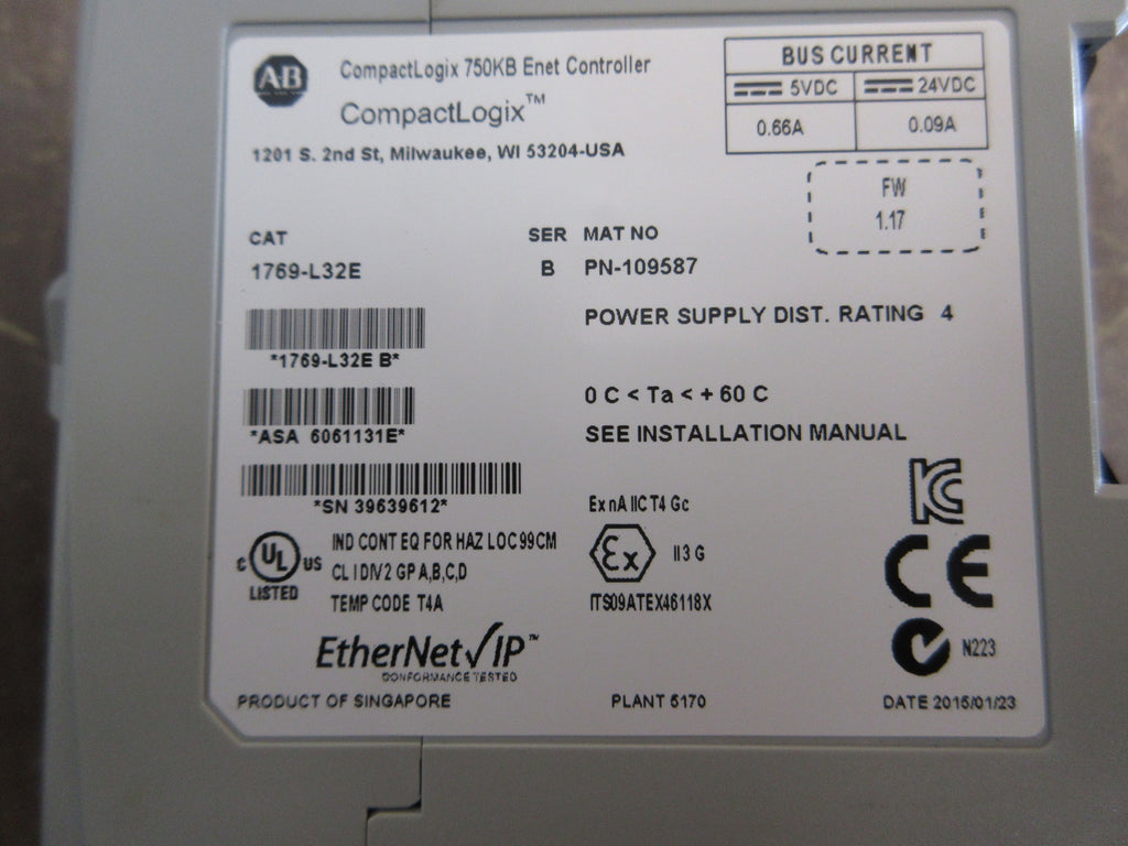Allen-Bradley CompactLogix 750KB Enet Controller Part #: 1769-L32E Ser. B F/W: 1.17 *No Key* *No SD Card* Used Loc: 59I3-23
