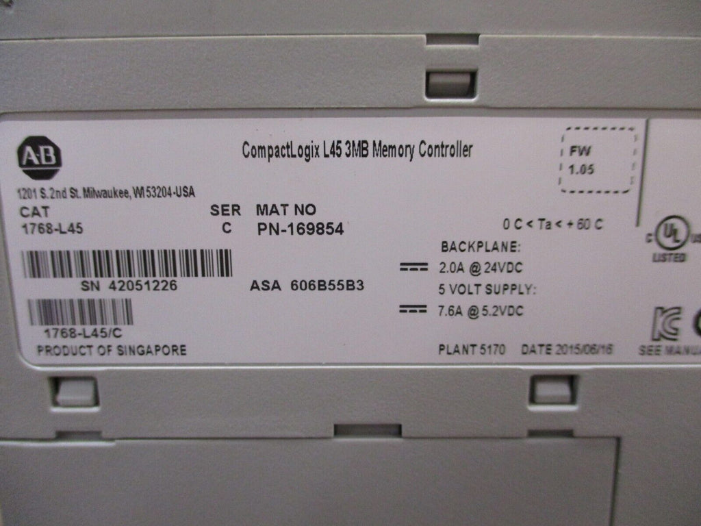 Allen-Bradley CompactLogix L45 3MB Memory Controller 1768-L45 Ser. C Used Condition: UsedBrand: Allen-BradleyController Platform: CompactLogixCountry/Region of Manufacture: SingaporeMPN: 1768-L45Type: Memory Controller Allen-Bradley CompactLogix L45 3MB Memory Controller 1768-L45 Ser. C Used Allen-Bradley CompactLogix L45 3MB Memory Controller Part #: 1768-L45 Ser. C F/W Rev. 1.05Used Loc: 27D4-21 Allen-Bradley CompactLogix L45 3MB Memory Controller Part #: 1768-L45 Ser. C F/W Rev. 1.05 Uséd Loc: 27D4-21