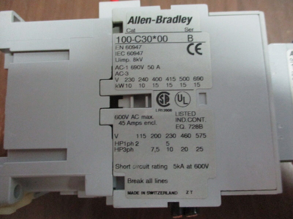 Allen-Bradley Contactor 100-C30*00 Ser. B 24V Coil 55A 600V w/ Aux Contact Used Condition: UsedBrand: Allen-BradleyCoil Voltage: 24 VCountry/Region of Manufacture: SwitzerlandCurrent Rating: 55 AMPN: 100-C30*00Maximum Amperage: 55 A Allen-Bradley Contactor 100-C30*00 Ser. B 24V Coil 55A 600V w/ Aux Contact Used Allen-Bradley Contactor Part #: 100-C30*00 Ser. B 24 V Coil 55 A 600 V w/ Aux Contact Used Loc: 18C4-72 Allen-Bradley Contactor Part #: 100-C30*00 Ser. B 24 V Coil 55 A 600 V w/ Aux Contact Uséd Loc: 18C4-72