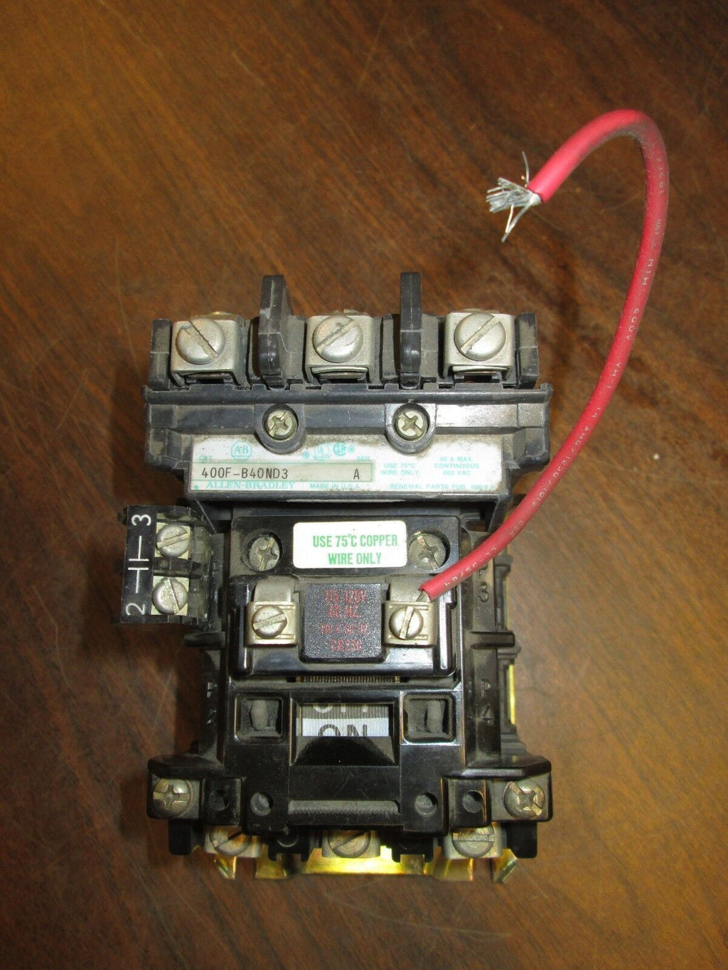Allen-Bradley Contactor 400F-B40ND3 30HP 120V Coil 3P Used Condition: UsedBrand: Allen-BradleyModel: ContactorMPN: 400F-B40ND3 Allen-Bradley Contactor 400F-B40ND3 30HP 120V Coil 3P Used Allen-Bradley Contactor 400F-B40ND3 30HP 120V Coil 3P UsedLOC# 15K4-15 Allen-Bradley Contactor 400F-B40ND3 30HP 120V Coil 3P Uséd LOC# 15K4-15