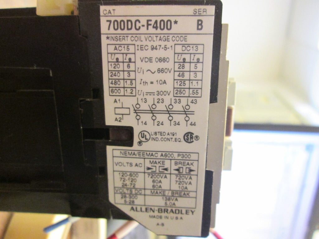 Allen-Bradley Contactor 700DC-F400* 24VDC Coil 10A Used_x000D_ Condition: UsedBrand: Allen-BradleyMPN: 700DC-F400* Allen-Bradley Contactor 700DC-F400* 24VDC Coil 10A Used Allen-Bradley ContactorPart # 700DC-F400* 24VDC Coil 10A UsedLOC 19K5-14 Allen-Bradley Contactor Part # 700DC-F400* 24VDC Coil 10A Uséd LOC 19K5-14