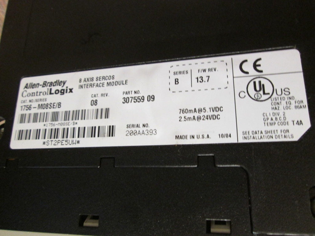 Allen-Bradley Control Logix 8 Axis Sercos Interface Module 1756-M08SE/B Ser. B Condition: UsedModel: Control Logix 8 Axis Sercos Interface ModuleMPN: 1756-M08SE/BBrand: Allen-BradleyController Platform: ControlLogixType: Interface Module Allen-Bradley Control Logix 8 Axis Sercos Interface Module 1756-M08SE/B Ser. B Allen-Bradley Control Logix 8 Axis Sercos Interface Module 1756-M08SE/BSer. B F/W Rev 13.7UsedLOC# 17G5-6 Allen-Bradley Control Logix 8 Axis Sercos Interface Module 1756-M08SE/B Ser. B F/W Rev 13.7 Uséd LOC# 17G5-6