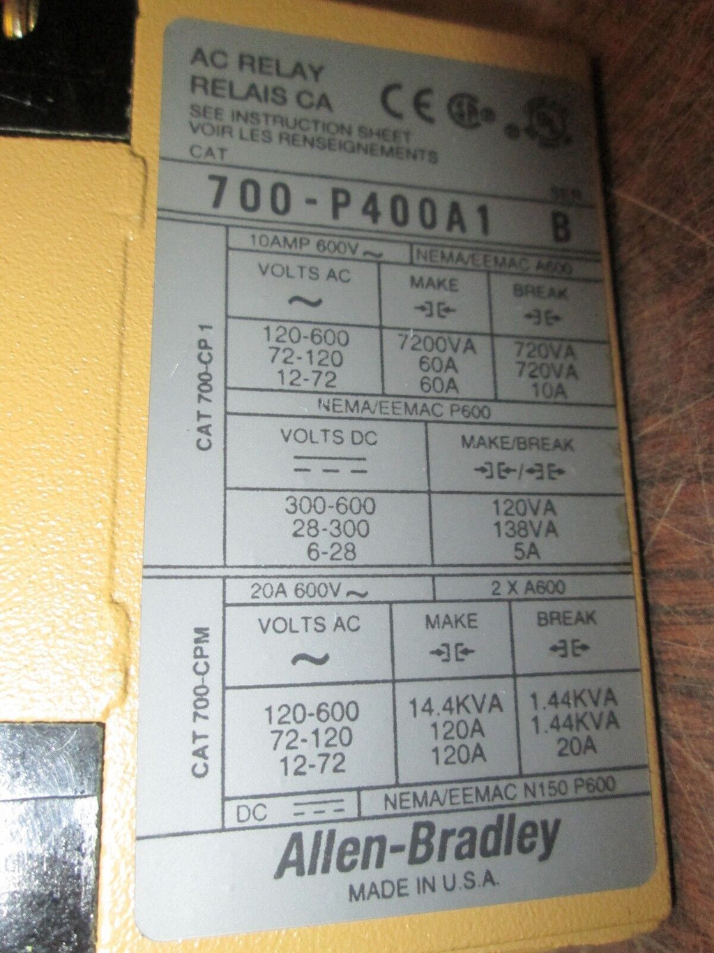 Allen-Bradley Control Relay 700-PB40 700-P400A1 Relay 115-120V...