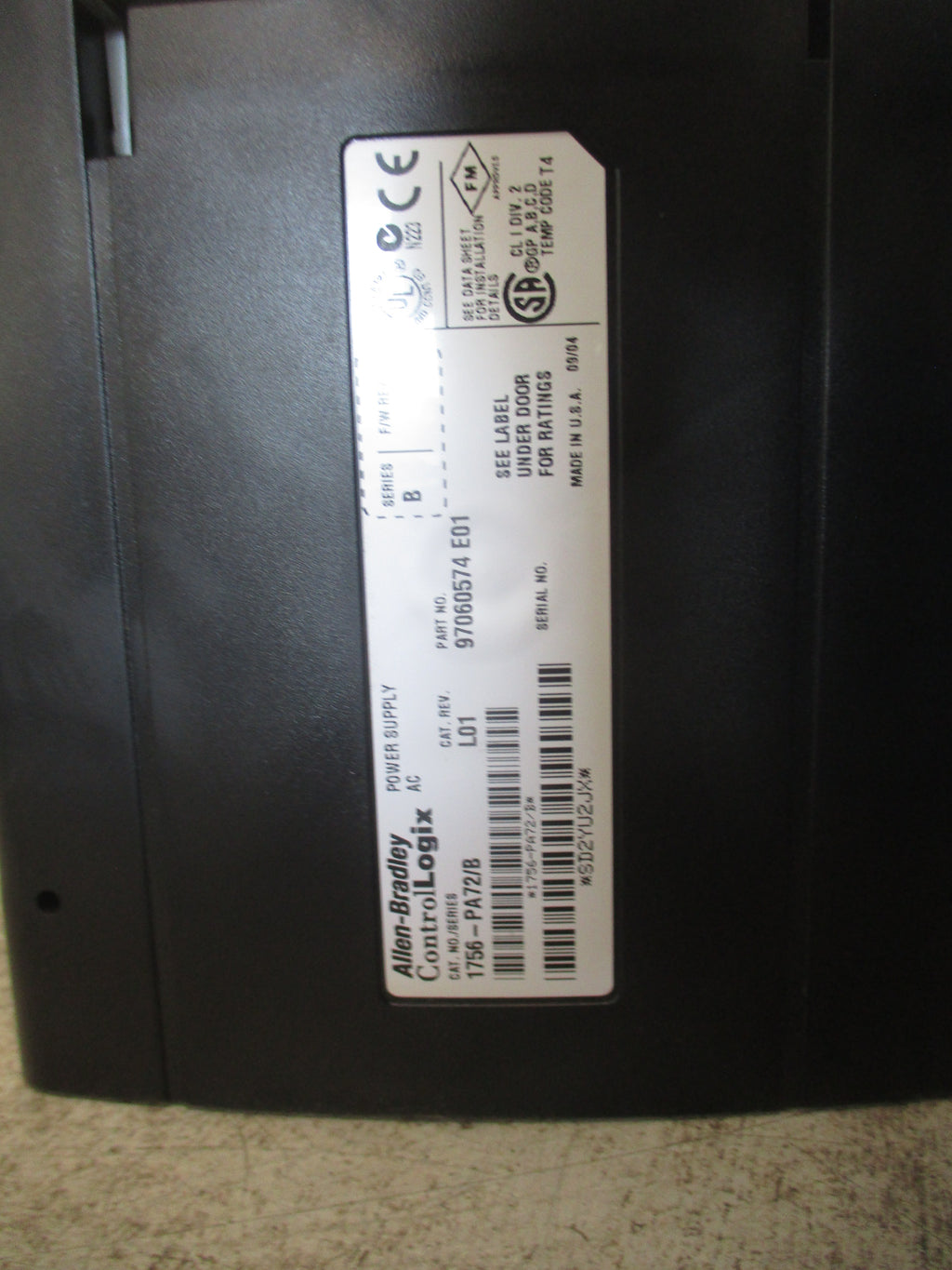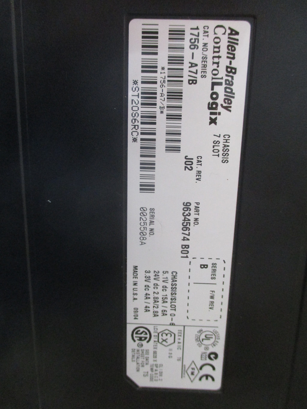 Allen-Bradley ControlLogix 7-Slot Chassis W/ Power Supply 1756A7/1756-PA72 Chassis: Ser. B Rev. J02 Power Supply: Ser. B Rev. L01 Used LOC 10E4-64