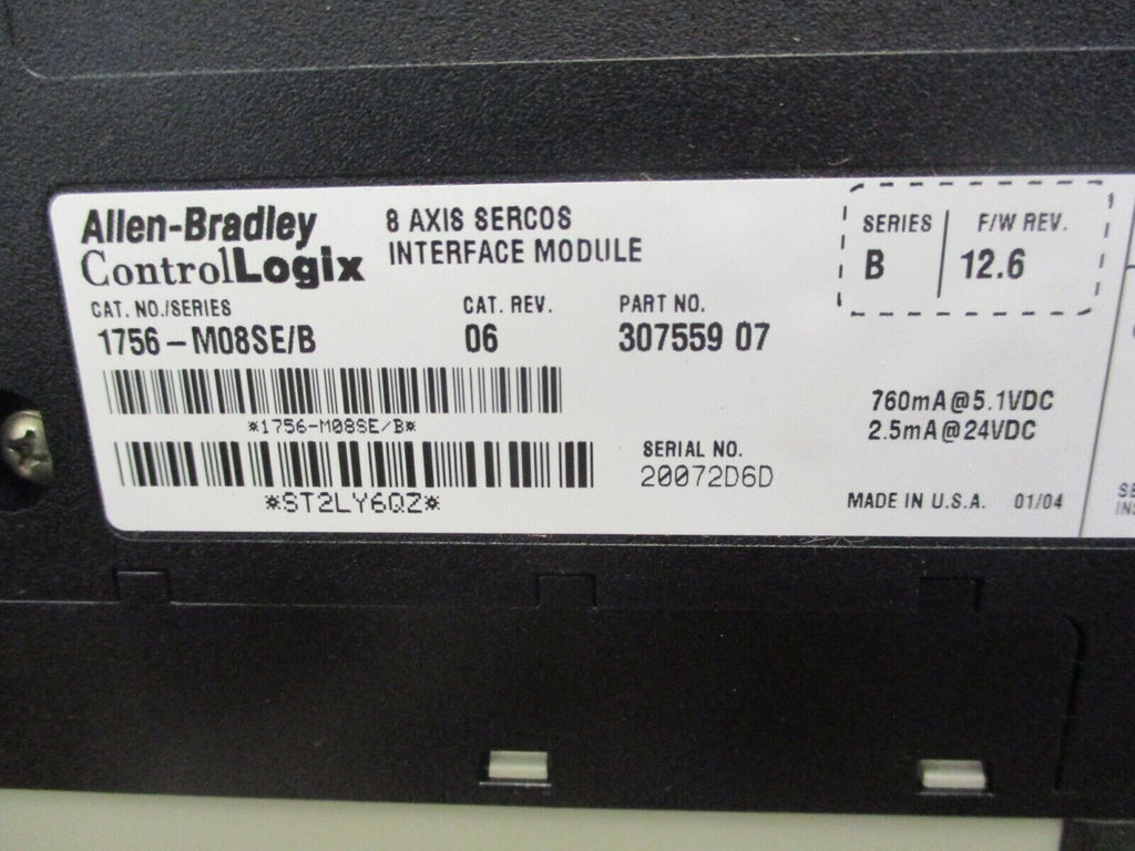 Allen-Bradley ControlLogix 8 Axis Sercos Interface Module 1756-M08SE/B Rev. 06_x000D_ Condition: UsedModel: Control Logix 8 Axis Sercos Interface ModuleController Platform: ControlLogixType: Interface ModuleMPN: 1756-M08SE/BBrand: Allen-Bradley Allen-Bradley ControlLogix 8 Axis Sercos Interface Module 1756-M08SE/B Rev. 06 Allen-Bradley ControlLogix 8 Axis Sercos Interface Module Part #: 1756-M08SE/BSer. B Rev. 06F/W Rev: 12.6UsedLOC 25A4-47 Allen-Bradley ControlLogix 8 Axis Sercos Interface Module Part #: 1756-M08SE/B Ser. B Rev. 06 F/W Rev: 12.6 Uséd LOC 25A4-47