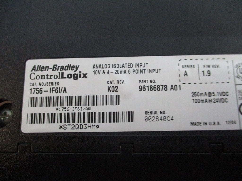 Allen-Bradley ControlLogix Analog Isolated Input Module 1756-IF6I Ser. A 6PT 10V_x000D_ Condition: UsedBrand: Allen-BradleyType: PLC Input ModuleAnalog/Digital: AnalogMPN: 1756-IF6IController Platform: ControlLogix Allen-Bradley ControlLogix Analog Isolated Input Module 1756-IF6I Ser. A 6PT 10V Allen-Bradley ControlLogix Analog Isolated Input Module Part #: 1756-IF6I Ser. A Rev. K02F/W Rev. 1.96PT 10 V 4-20mA Used Loc: 21B2-90 Allen-Bradley ControlLogix Analog Isolated Input Module Part #: 1756-IF6I Ser. A Rev. K02 F/W Rev. 1.9 6PT 10 V 4-20mA Uséd Loc: 21B2-90