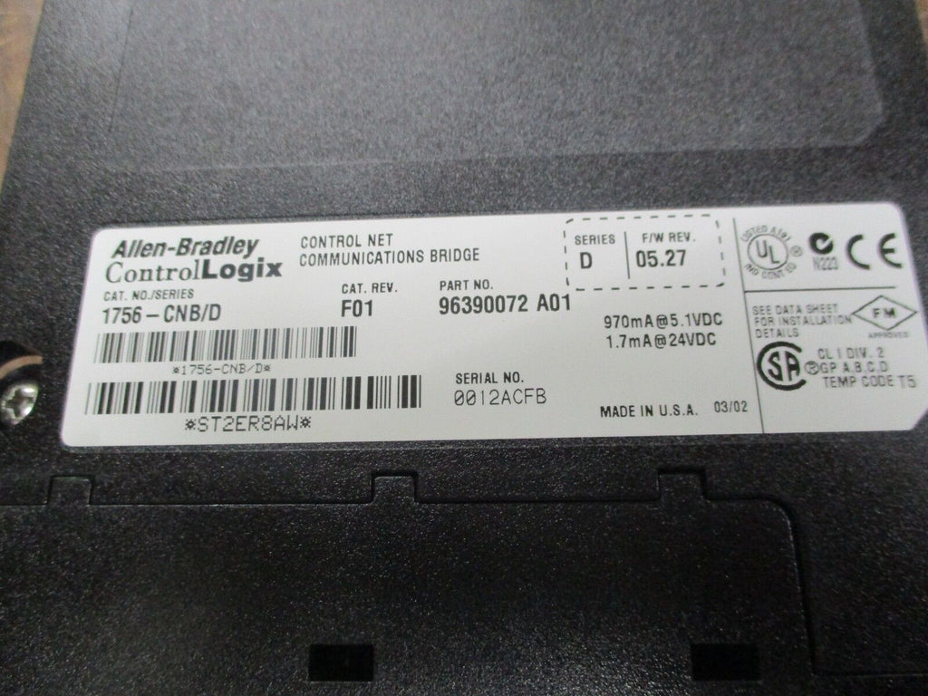 Allen-Bradley ControlLogix ControlNet Comm Bridge Module 1756-CNB/D Rev. F01_x000D_ Condition: UsedMPN: 1756-CNB/DBrand: Allen-Bradley Allen-Bradley ControlLogix ControlNet Comm Bridge Module 1756-CNB/D Rev. F01 Allen-Bradley ControlLogix ControlNet Comm Bridge Module Part #: 1756-CNB/D Rev F01 F/W: Ser DRev. 05.27*Broken Cover*UsedLOC 19B5-3 Allen-Bradley ControlLogix ControlNet Comm Bridge Module Part #: 1756-CNB/D Rev F01 F/W: Ser D Rev. 05.27 *Broken Cover* Uséd LOC 19B5-3