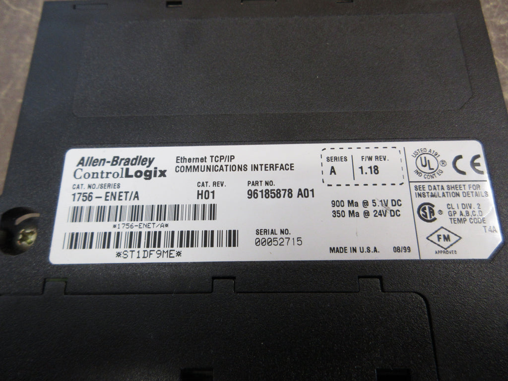 Allen-Bradley ControlLogix Ethernet TCP/IP Comm. Interface Part #: 1756-ENET Ser. A Rev. H01 F/W Rev. 1.18 Used Loc: 57C5-18