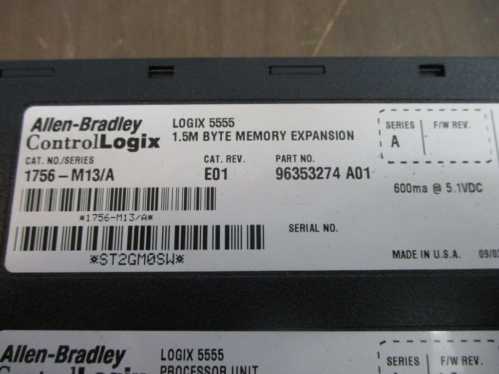 Allen-Bradley ControlLogix Logix 5555 Processor Unit 1756-L55/A Ser. A Rev. G01_x000D_ Condition: UsedModel: Allen-Bradley 1756-L55/AMPN: 1756-L55/ABrand: Allen-BradleyController Platform: ControlLogix Allen-Bradley ControlLogix Logix 5555 Processor Unit 1756-L55/A Ser. A Rev. G01 Allen-Bradley ControlLogix Logix 5555 Processor Unit w/ Non-Volatile Memory ExpansionPart #: 1756-L55/A Ser. A Rev. G01F/W Rev.: 1.2Memory Expansion:Cat #: 1756-M13/ARev. E011.5MBUsedLoc: 10D5-29 Allen-Bradley ControlLogix Logix 5555 Processor Unit w/ Non-Volatile Memory Expansion Part #: 1756-L55/A Ser. A Rev. G01 F/W Rev.: 1.2 Memory Expansion: Cat #: 1756-M13/A Rev. E01 1.5MB Uséd Loc: 10D5-29