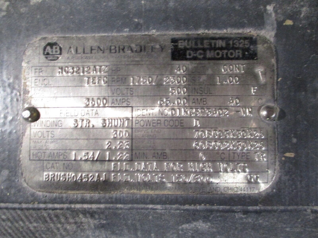 Allen-Bradley DC Motor 40HP 500V 65A 1800/2400RPM Used Allen-Bradley DC Motor 40 HP 500 V 65 A 1750 / 2300 RPMDims: 52" x 28" x 20"Weighs: 1200 LBS Used Loc: AB11-7236 / AB39F1 Allen-Bradley DC Motor 40 HP 500 V 65 A 1750 / 2300 RPMDims: 52" x 28" x 20"Weighs: 1200 LBS Uséd Loc: AB11-7236 / AB39F1