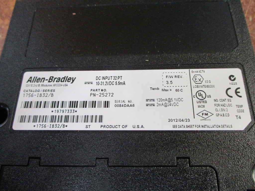 Allen-Bradley DC Output Module Part #: 1756-IB32/B F/W Rev.: 3.5 32-PT 10-31.2 VDC 5.5mA Used LOC 17A4-22