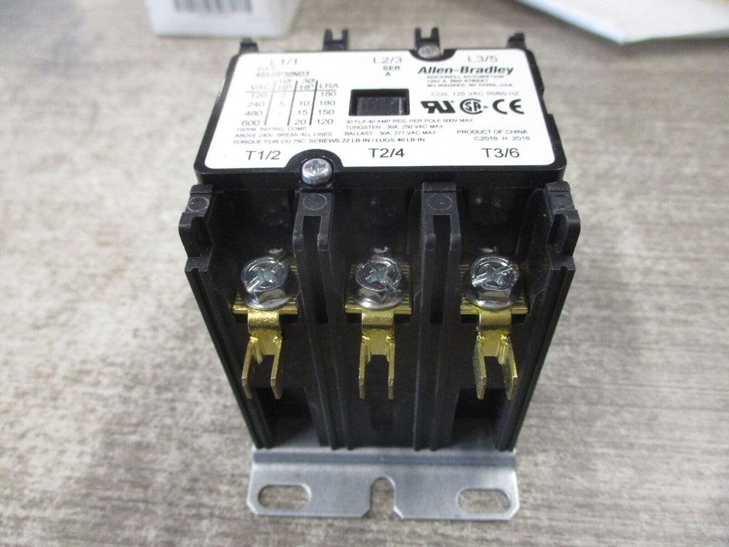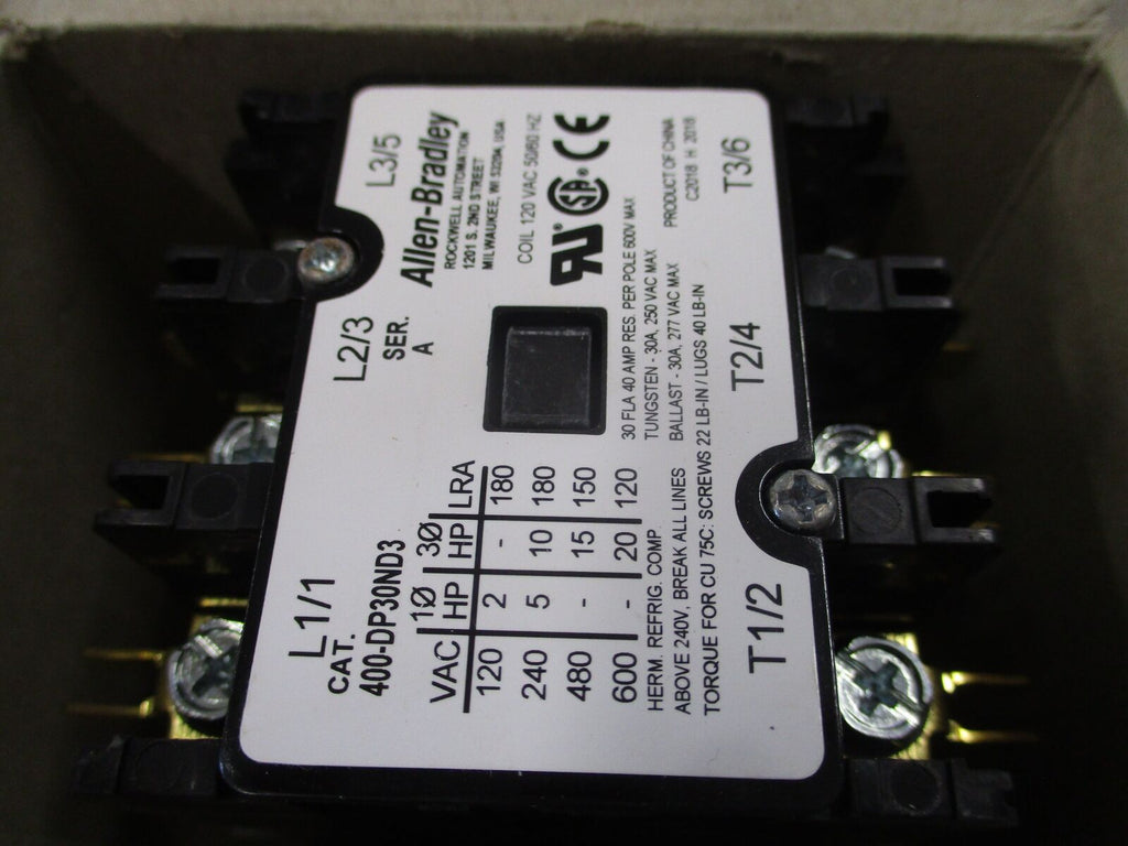 Allen-Bradley Definite Purpose Contactor 400-DP30ND3 Ser. A 120V coil 30A 3P New Surplus_x000D_ Allen-Bradley Definite Purpose Contactor 400-DP30ND3 Ser. A 120V coil 30A 3P New Surplus LOC 60A2-13