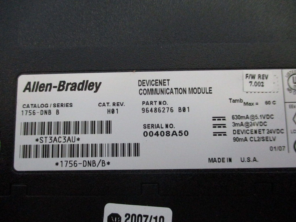 Allen-Bradley DeviceNet Comm. Module 1756-DNB Ser. B Rev. H01 F/W Rev: 7.002