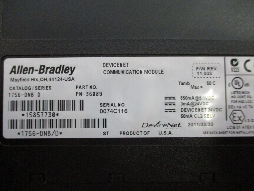 Allen-Bradley DeviceNet Comm. Module 1756-DNB Ser. D F/W Rev: 11.003 Used_x000D_ Condition: UsedBrand: Allen-BradleyMPN: 1756-DNB Allen-Bradley DeviceNet Comm. Module 1756-DNB Ser. D F/W Rev: 11.003 Used Allen-Bradley DeviceNet Comm. Module Part #: 1756-DNB Ser. D F/W Rev: 11.003 Used Loc: 16K3-97 Allen-Bradley DeviceNet Comm. Module Part #: 1756-DNB Ser. D F/W Rev: 11.003 Uséd Loc: 16K3-97