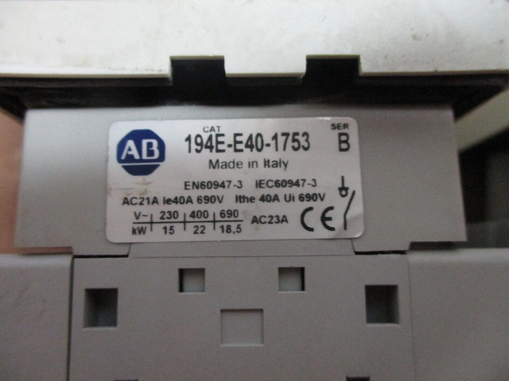Allen-Bradley Disconnect Switch 194E-E40-1753 Ser. B 40A Used_x000D_ Condition: UsedBrand: Allen-BradleyMaximum Amperage: 40 ACurrent Rating: 31-40 AMPN: 194E-E40-1753 Allen-Bradley Disconnect Switch 194E-E40-1753 Ser. B 40A Used Allen-Bradley Disconnect Switch Part #: 194E-E40-1753 Ser. B 40 A Used Loc: 12A2-16 / 16G2 Allen-Bradley Disconnect Switch Part #: 194E-E40-1753 Ser. B 40 A Uséd Loc: 12A2-16 / 16G2