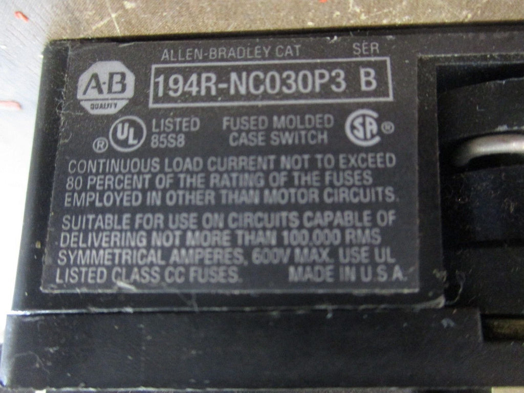 Allen-Bradley Disconnect Switch 194R-NC030P3 Ser. B 30A 600V Used