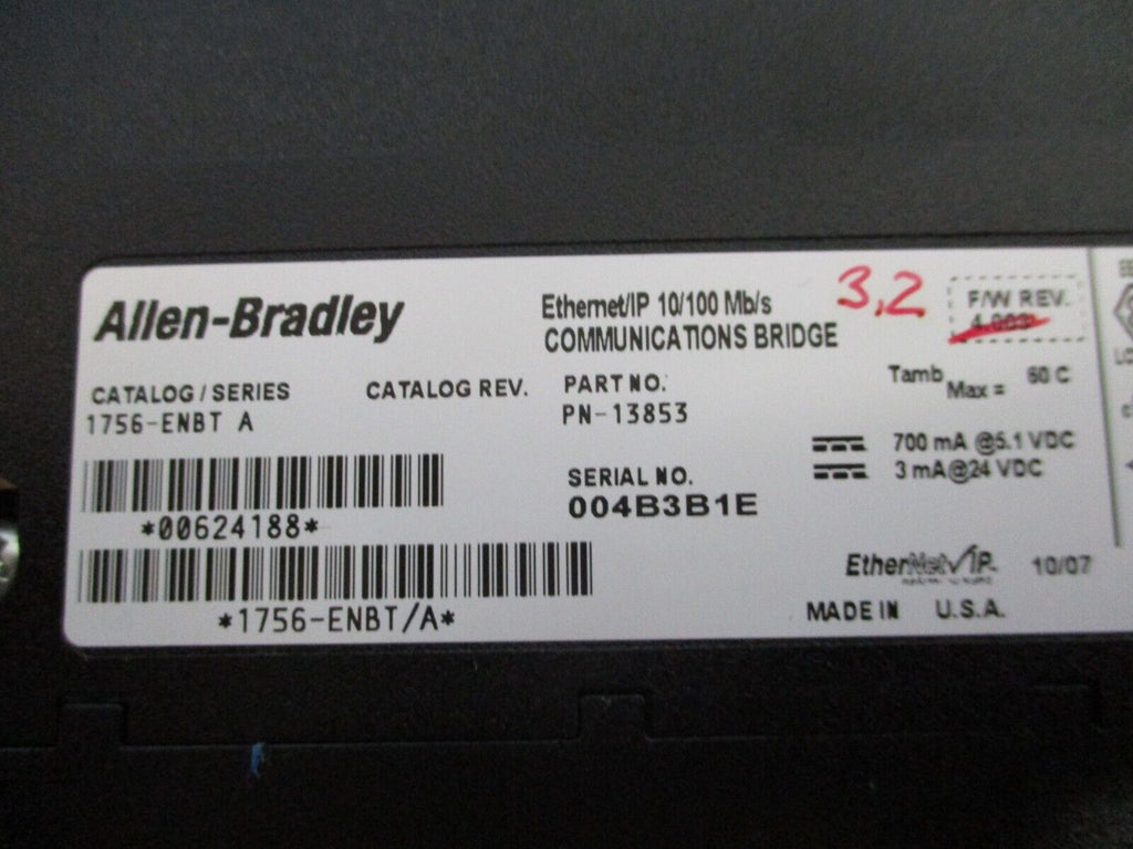 Allen-Bradley Ethernet/IP Comm. Bridge Module Part #: 1756-ENBT Ser. A F/W Rev. 3.2 (4.003 Original)Used Loc: 16I3-52- Part #: 1756-ENBT