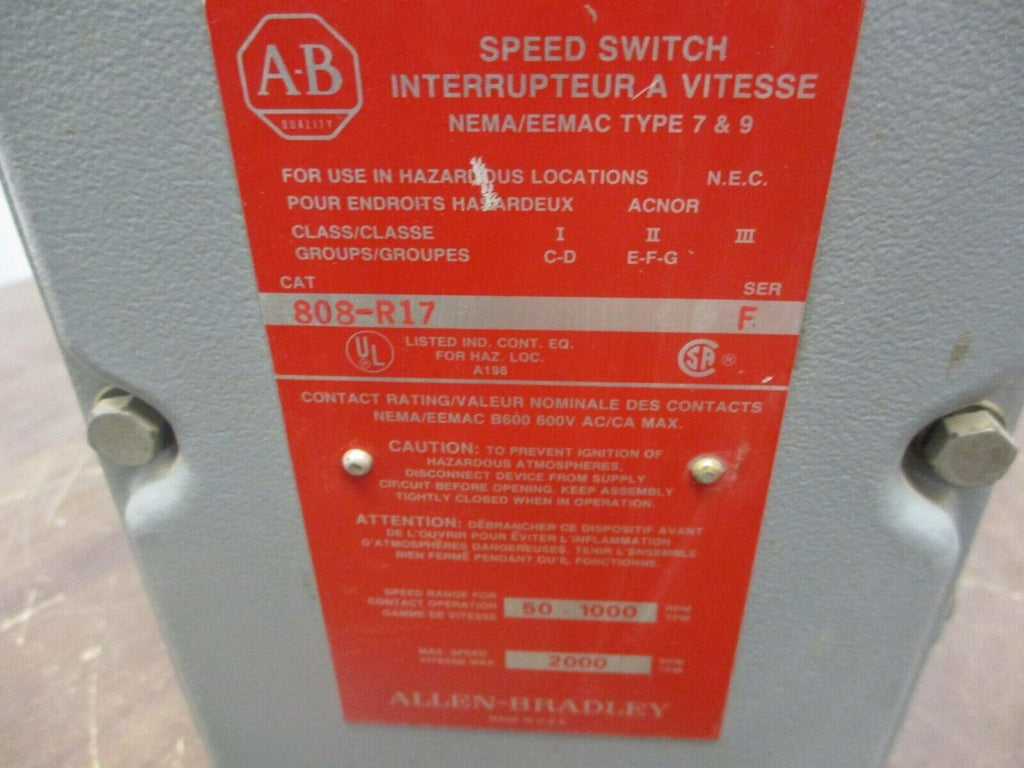 Allen-Bradley Explosion Proof Speed Switch 808-R17 Ser. F Max Speed:2000RPM Used Condition: UsedMPN: 808-R17Brand: Allen-Bradley Allen-Bradley Explosion Proof Speed Switch 808-R17 Ser. F Max Speed:2000RPM Used Allen-Bradley Explosion Proof Speed Switch Part #: 808-R17 Ser. F Max Speed: 2000RPM Contact Operation: 50-1000RPMUsedLOC 14H3-10 Allen-Bradley Explosion Proof Speed Switch Part #: 808-R17 Ser. F Max Speed: 2000RPM Contact Operation: 50-1000RPM Uséd LOC 14H3-10