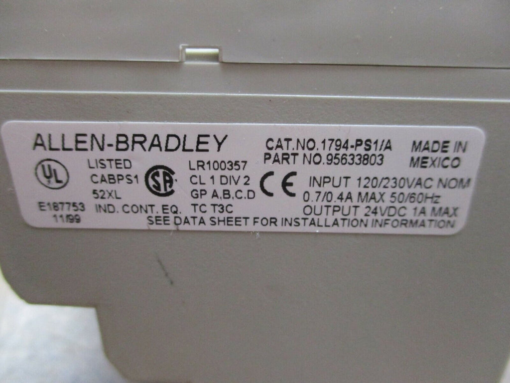 Allen-Bradley Flex I/O 24VDC Power Supply 1794-PSI/A Used_x000D_ Allen-Bradley Flex I/O 24VDC Power Supply Part #: 1794-PSI/A Input:120/230VAC0.7/0.4A50/60HzOutput:24VDC1AUsedLOC 20G5-28_x000D_ Allen-Bradley Flex I/O 24VDC Power Supply _x000D_ Part #: 1794-PSI/A _x000D_ Input:_x000D_ 120/230VAC_x000D_ 0.7/0.4A_x000D_ 50/60Hz_x000D_ Output:_x000D_ 24VDC_x000D_ 1A_x000D_ Uséd_x000D_ _x000D_ _x000D_ _x000D_ _x000D_ _x000D_ _x000D_ LOC 20G5-28_x000D_