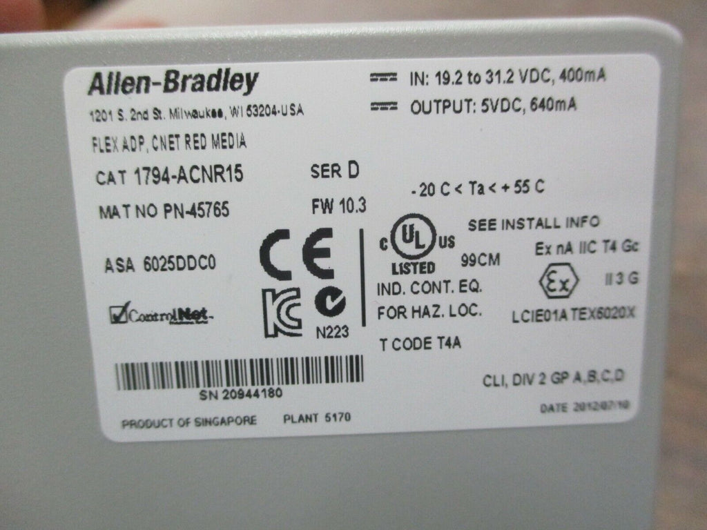 Allen-Bradley Flex I/O ControlNet Redundant Media Adapter 1794-ACNR15 Ser D Used Condition: UsedMPN: 1794-ACNR15Brand: Allen-Bradley Allen-Bradley Flex I/O ControlNet Redundant Media Adapter 1794-ACNR15 Ser D Used Allen-Bradley Flex I/O ControlNet Redundant Media Adapter Part #: 1794-ACNR15 Ser. D F/W: 10.3Input:19.2-31.2VDC400mAOutput:5VDC640mAUsedLOC 18J4-45 Allen-Bradley Flex I/O ControlNet Redundant Media Adapter Part #: 1794-ACNR15 Ser. D F/W: 10.3 Input: 19.2-31.2VDC 400mA Output: 5VDC 640mA Uséd LOC 18J4-45