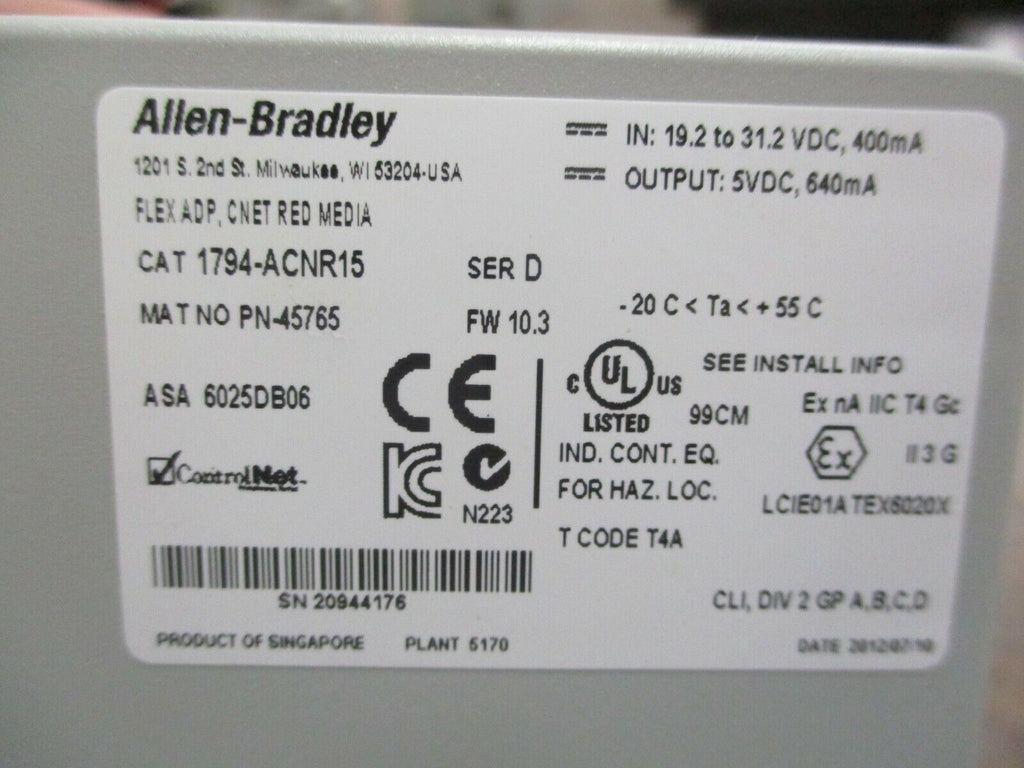 Allen-Bradley Flex I/O ControlNet Redundant Media Adapter 1794-ACNR15 Ser D Used_x000D_ Condition: UsedMPN: 1794-ACNR15Brand: Allen-Bradley Allen-Bradley Flex I/O ControlNet Redundant Media Adapter 1794-ACNR15 Ser D Used Allen-Bradley Flex I/O ControlNet Redundant Media Adapter Part #: 1794-ACNR15 Ser. D FW: 10.3Input: 19.2 - 31.2VDC400mAOutput:5VDC 640mA UsedLOC 16H3-65 Allen-Bradley Flex I/O ControlNet Redundant Media Adapter Part #: 1794-ACNR15 Ser. D FW: 10.3 Input: 19.2 - 31.2VDC 400mA Output: 5VDC 640mA Uséd LOC 16H3-65