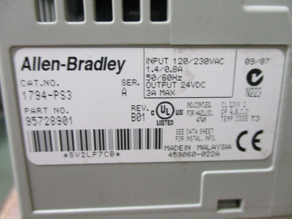 Allen-Bradley Flex I/O Power Supply 1794-PS3 Ser.A Rev. B01 Used Condition: UsedMPN: 1794-PS3Brand: Allen-Bradley Allen-Bradley Flex I/O Power Supply 1794-PS3 Ser.A Rev. B01 Used Allen-Bradley Flex I/O Power Supply Part # 1794-PS3 Ser.A Rev. B01 Input: 120/230V, 50/60Hz, 1.4/0.8AOutput: 24 VDC, 3A UsedLOC 24E3-35 Allen-Bradley Flex I/O Power Supply Part # 1794-PS3 Ser.A Rev. B01 Input: 120/230V, 50/60Hz, 1.4/0.8A Output: 24 VDC, 3A Uséd LOC 24E3-35