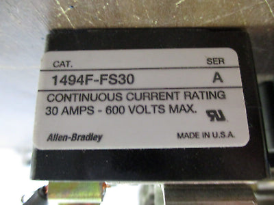 Allen-Bradley Fuse Holder 1494F-FS30 Ser. A 30A 600V 3P w/ (3) 15A Fuses Used Condition: UsedBrand: Allen-BradleyColor: BlackCurrent Rating: 16-30 AMPN: 1494F-FS30Type: Fuse HolderVoltage: 600 V Allen-Bradley Fuse Holder 1494F-FS30 Ser. A 30A 600V 3P w/ (3) 15A Fuses Used Allen-Bradley Fuse Holder Part #: 1494F-FS30 Ser. A 30 A 600 V 3P w/ (3) 15A Fuses Used Loc: 20F2-38 Allen-Bradley Fuse Holder Part #: 1494F-FS30 Ser. A 30 A 600 V 3P w/ (3) 15A Fuses Uséd Loc: 20F2-38