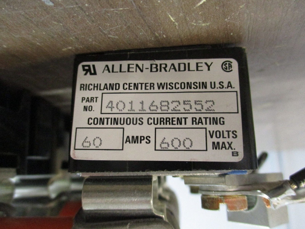 Allen-Bradley Fuse Holder w/ Fuses 4011682552 60A 600V 3P w/ (3) 60a Fuses Used_x000D_ Condition: UsedMaximum Amperage: 60 ANumber of Poles: 3MPN: 4011682552Brand: Allen-BradleyVoltage: 551-600 V Allen-Bradley Fuse Holder w/ Fuses 4011682552 60A 600V 3P w/ (3) 60a Fuses Used Allen-Bradley Fuse Holder w/ Fuses Part #: 4011682552 60 A 600 V 3P w/ (3) 60a Fuses Used Loc: 19B5-36 Allen-Bradley Fuse Holder w/ Fuses Part #: 4011682552 60 A 600 V 3P w/ (3) 60a Fuses Uséd Loc: 19B5-36