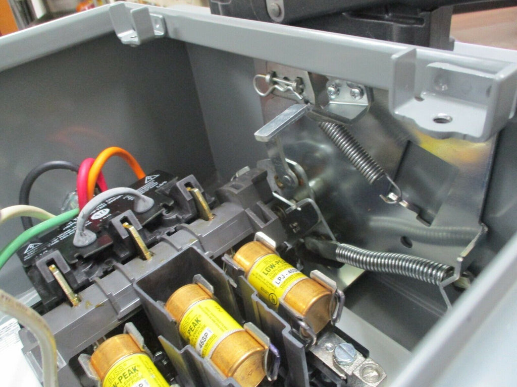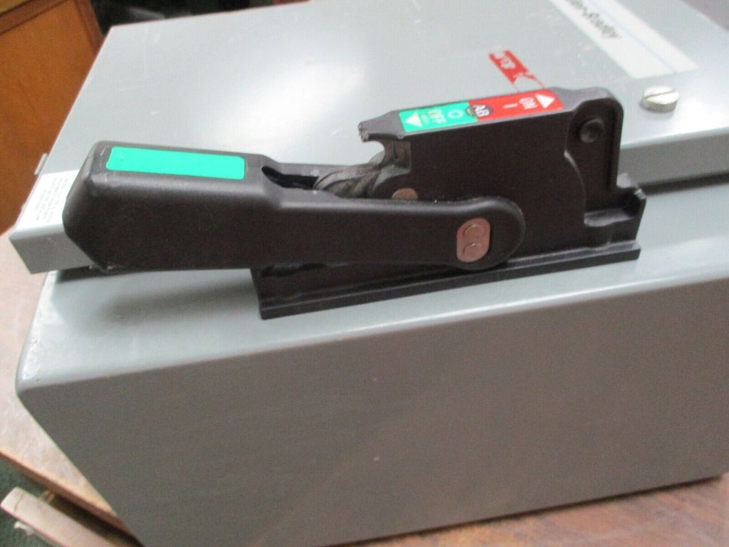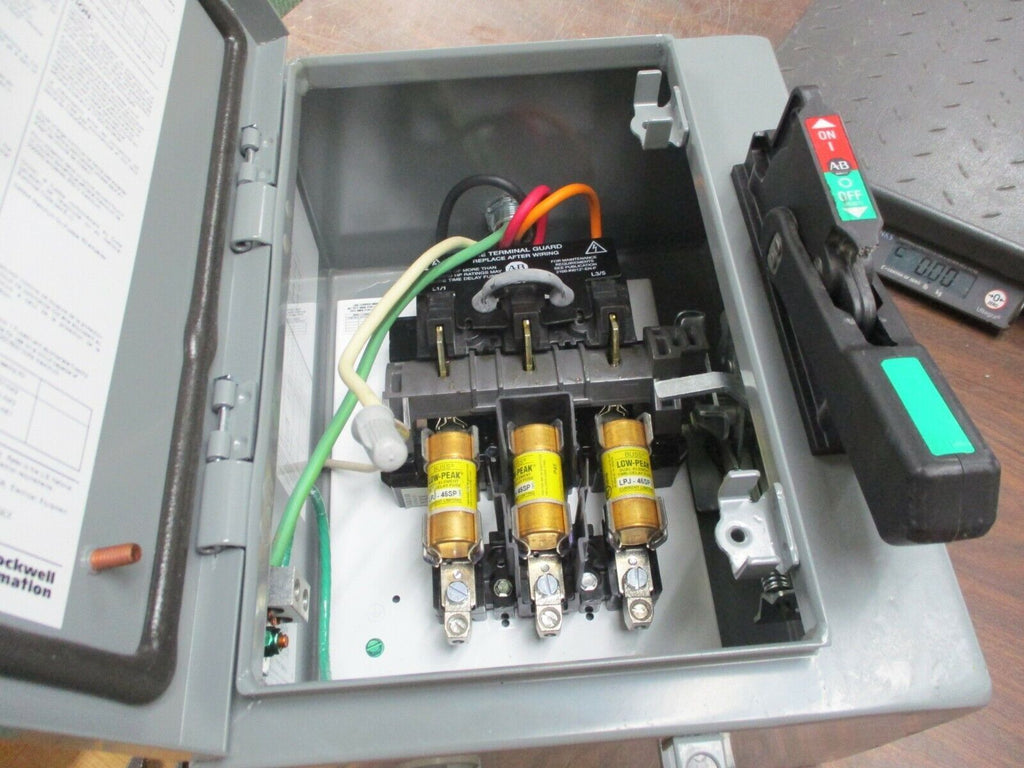 Allen-Bradley Fusible 3R Safety Switch 1494G-CF3J6 60A 3P Enclosure 3R/4/12 Used Condition: UsedCurrent Rating: 51-60 AMaximum Amperage: 60 AType: DisconnectorMPN: 1494G-CF3J6Brand: Allen-Bradley Allen-Bradley Fusible 3R Safety Switch 1494G-CF3J6 60A 3P Enclosure 3R/4/12 Used Allen-Bradley Fusible 3R Safety Switch Part # 1494G-CF3J6 60A 3P Enclosure: 3R/4/12 Used*Chipped Handle*LOC 9B3-14 Allen-Bradley Fusible 3R Safety Switch Part # 1494G-CF3J6 60A 3P Enclosure: 3R/4/12 Uséd *Chipped Handle* LOC 9B3-14