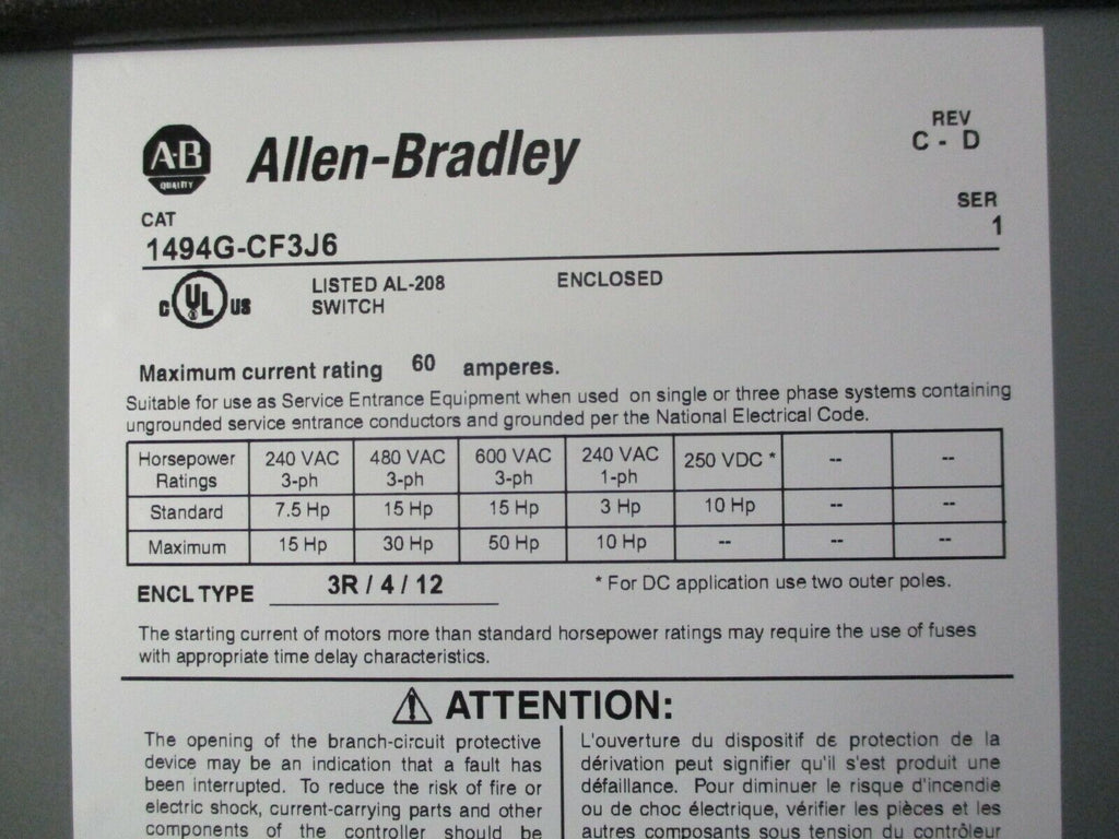 Allen-Bradley Fusible 3R Safety Switch 1494G-CF3J6 60A 3P Encl...