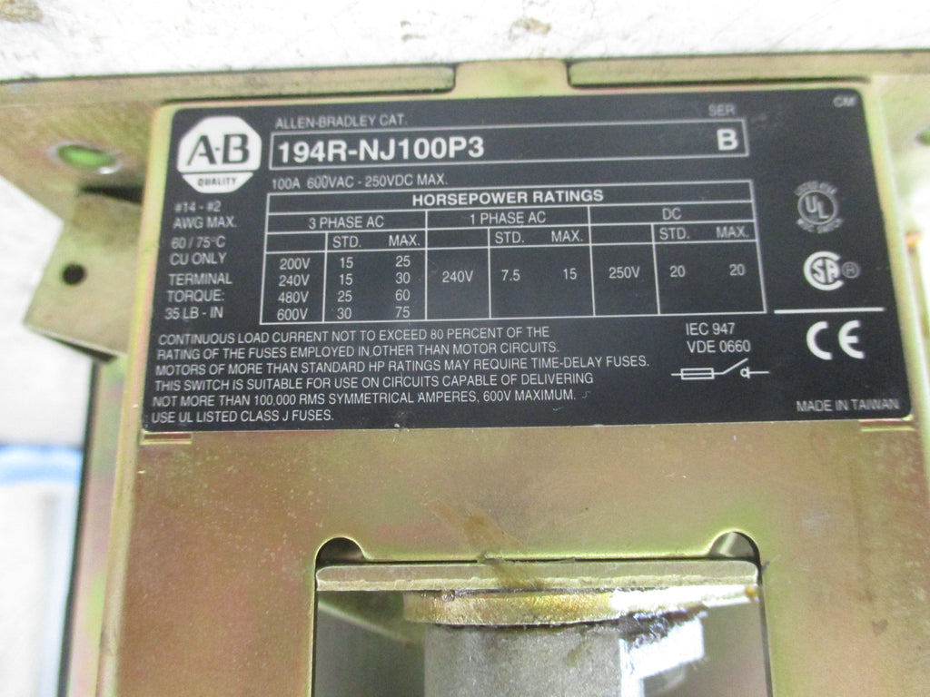 Allen-Bradley Fusible Disconnect Switch 194R-NJ100P3 Ser. B 100A 600V 3Ph Used.