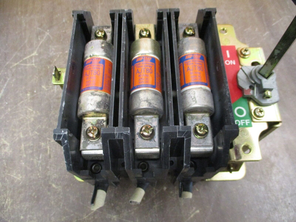 Allen-Bradley Fusible Disconnect Switch Part #: 194R-NJ100P3 Ser. B 100 A 600 V 3Ph w/ (3) 80 A Fuses *Broken Cover* Used Loc: 24C1-5