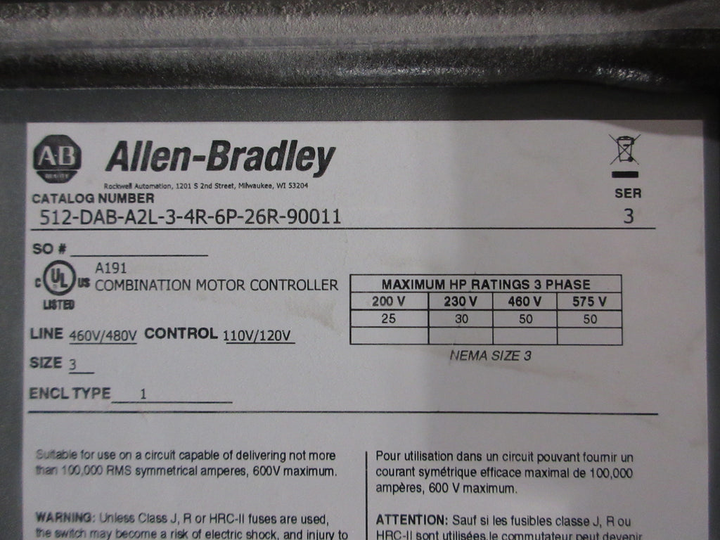 Allen-Bradley Fusible Size 3 Combination Part #: 512-DAB-A2L-3-4R-6P-26R-90011 120 V Coil 480 V Type 1 Enclosure Dims: 31" x 21" x 12" Weighs: 115 LBS Used Loc: AB11-8438 / AB29A4