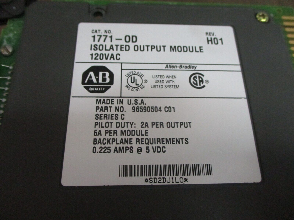 Allen-Bradley Isolated Output Module 1771-OD Rev. H01 120VAC Used_x000D_ Condition: UsedModel: Allen-Bradley 1771-ODMPN: 1771-ODBrand: Allen-BradleyType: PLC Output Module Allen-Bradley Isolated Output Module 1771-OD Rev. H01 120VAC Used Allen-Bradley Isolated Output Module Part #: 1771-OD Rev. H01 120 VAC Used Loc: 13G2-51 Allen-Bradley Isolated Output Module Part #: 1771-OD Rev. H01 120 VAC Uséd Loc: 13G2-51