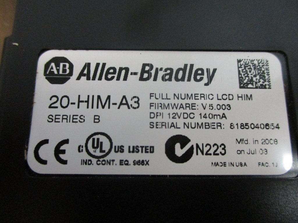 Allen-Bradley Keypad w/ External Mount Part #: 20-HIM-A3 Ser. B F/W: V 5.003 Used Loc: 23C2-12- Part #: 20-HIM-A3