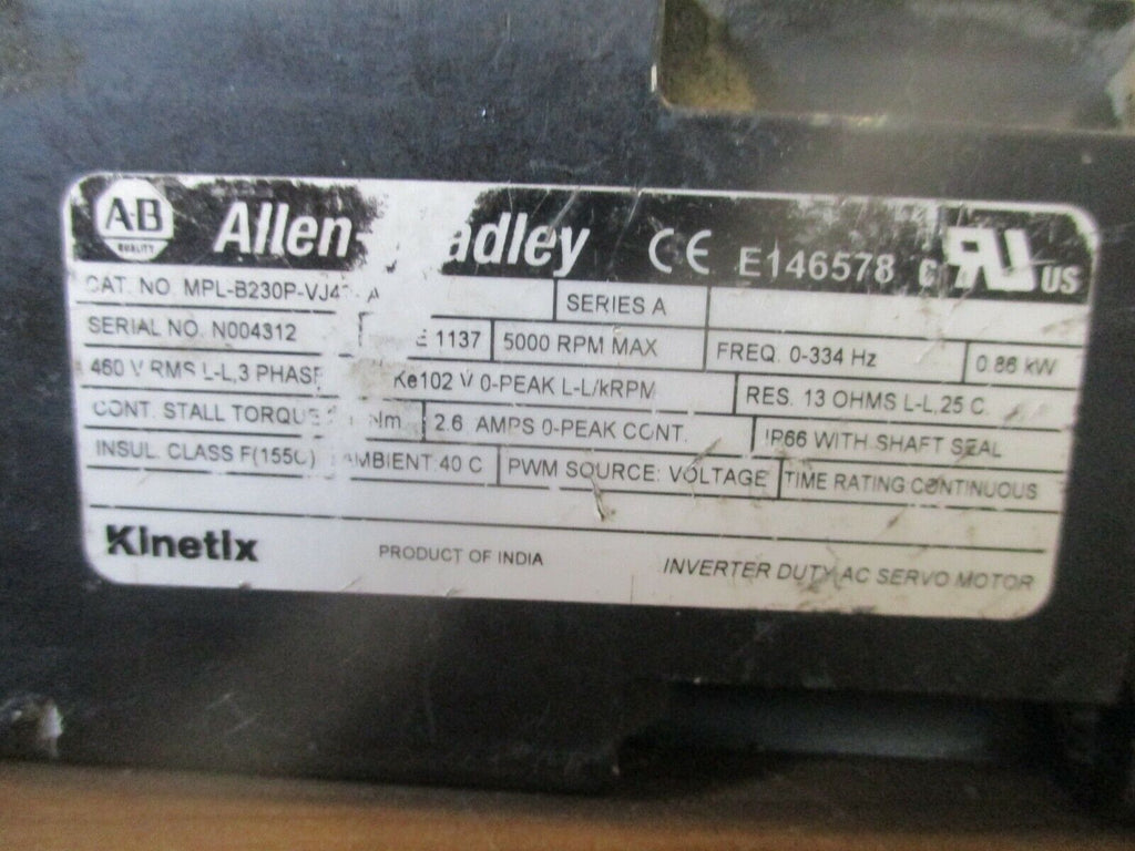 Allen-Bradley Kinetix AC Servo Motor Part #: MPL-B230P-VJ42AA Ser. A 0.86KW 5000RPM 460V 2.6A 0-334Hz *Missing Rear Cover* Used LOC 12A2-7