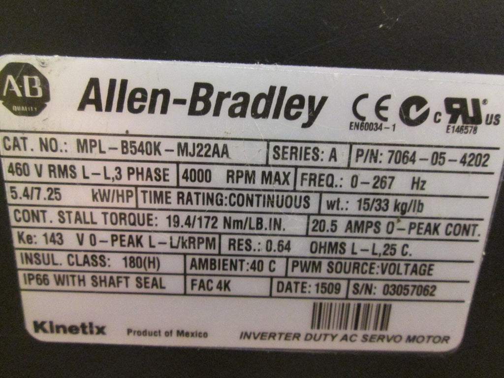 Allen-Bradley Kinetix AC Servo Motor MPL-B540K-MJ22AA 7.25HP 460V 3Ph Used Condition: UsedBrand: Allen-BradleyMPN: MPL-B540K-MJ22AA Allen-Bradley Kinetix AC Servo Motor MPL-B540K-MJ22AA 7.25HP 460V 3Ph Used Allen-Bradley Kinetix AC Servo Motor Part #: MPL-B540K-MJ22AA 7.25HP 460V 3Ph 4000RPM0-267HzUsedLOC 12C4-25 Allen-Bradley Kinetix AC Servo Motor Part #: MPL-B540K-MJ22AA 7.25HP 460V 3Ph 4000RPM 0-267Hz Uséd LOC 12C4-25