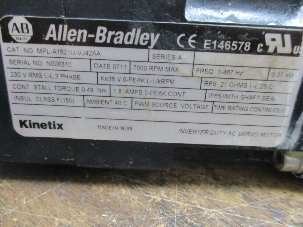 Allen-Bradley Kinetix AC Servo Motor w/ Gearbox & Linear Actuator 0.27kW 7000RPM Condition: UsedMPN: MPL-A1520U-VJ42AABrand: Allen-Bradley Allen-Bradley Kinetix AC Servo Motor w/ Gearbox & Linear Actuator 0.27kW 7000RPM Allen-Bradley Kinetix AC Servo Motor w/ Gearbox & Linear ActuatorPart #: MPL-A1520U-VJ42AA0.27kW 7000RPM230V3Ph0-467HzThomson-Micron Gearbox:Part #: 32-513753-9324Model #: NTR23-002-0-RM060-790°Size: 23Ratio 2:1Parker Linear Actuator:Part #: EMX070629UsedLOC 15G2-48 Allen-Bradley Kinetix AC Servo Motor w/ Gearbox & Linear Actuator Part #: MPL-A1520U-VJ42AA 0.27kW 7000RPM 230V 3Ph 0-467Hz Thomson-Micron Gearbox: Part #: 32-513753-9324 Model #: NTR23-002-0-RM060-7 90° Size: 23 Ratio 2:1 Parker Linear Actuator: Part #: EMX070629 Uséd LOC 15G2-48