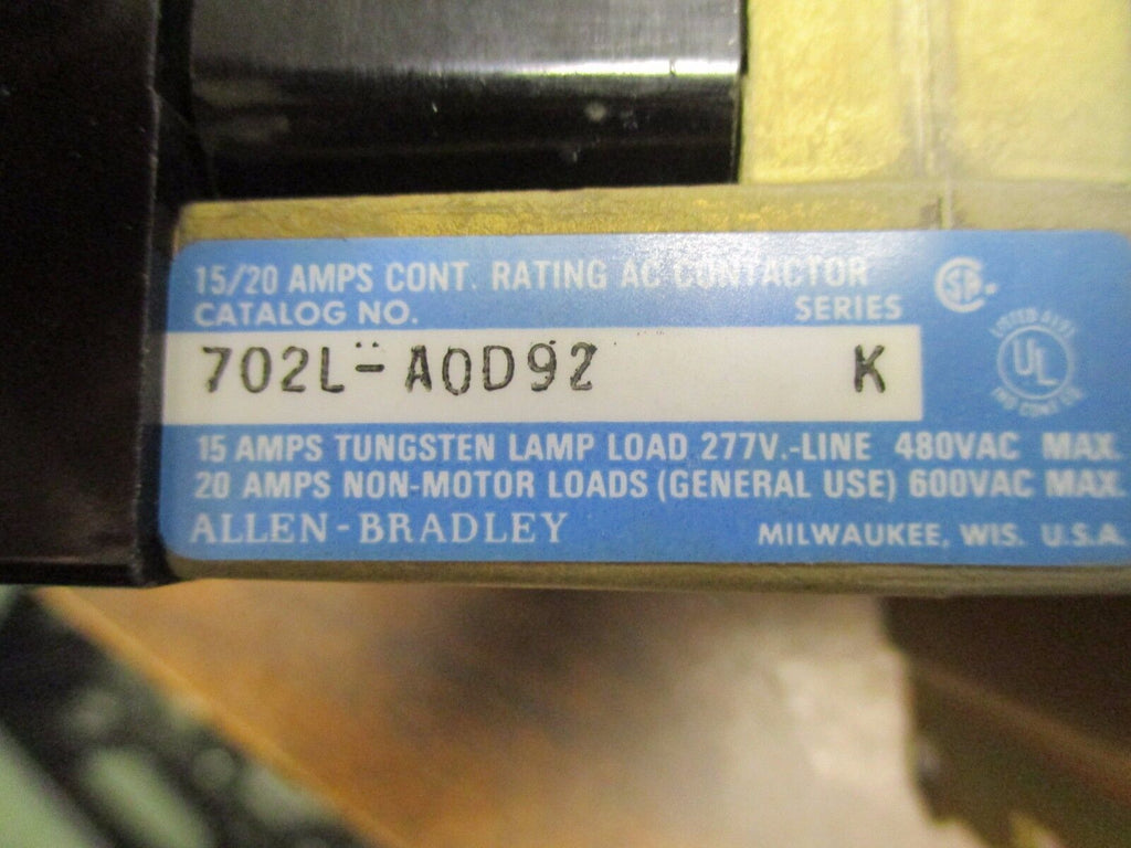 Allen-Bradley Lighting Contactor 702L-AOD92 120V Coil Used Condition: UsedBrand: Allen-BradleyMPN: 702L-AOD92 Allen-Bradley Lighting Contactor 702L-AOD92 120V Coil Used Allen-Bradley Lighting Contactor Part #: 702L-AOD92 120V Coil UsedLOC 3B5-33 Allen-Bradley Lighting Contactor Part #: 702L-AOD92 120V Coil Uséd LOC 3B5-33