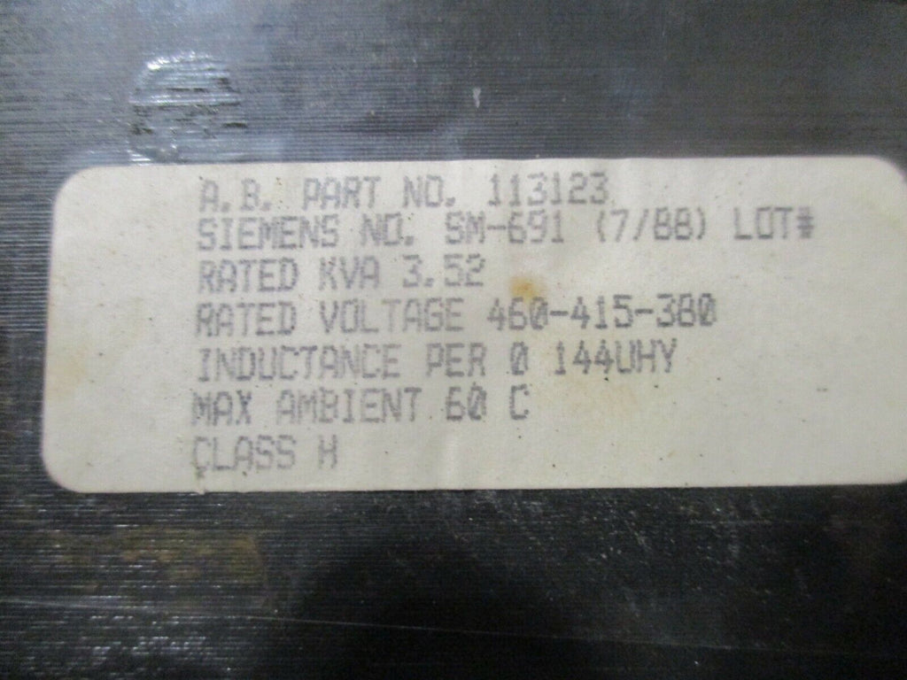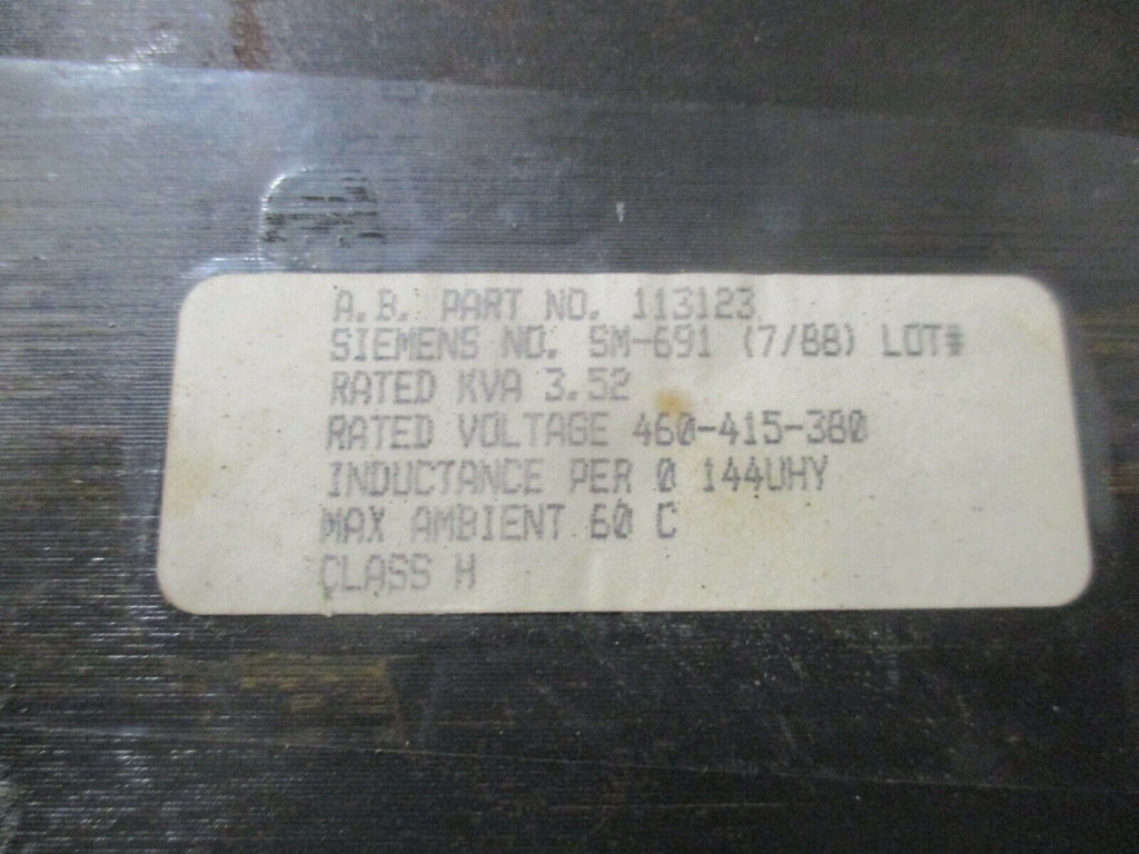 Allen-Bradley Line Reactor 113123 3.52KVA 460/415/380V Used Condition: UsedNominal Power Rating: 3.52 kVAMPN: 113123Brand: Allen-Bradley Allen-Bradley Line Reactor 113123 3.52KVA 460/415/380V Used Allen-Bradley Line Reactor Part #: 113123 3.52KVA 460/415/380V UsedLOC AB6K4-7 Allen-Bradley Line Reactor Part #: 113123 3.52KVA 460/415/380V Uséd LOC AB6K4-7