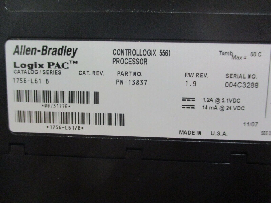 Allen-Bradley LogicPAC ControlLogix 5561 Processor Module 1756-L61 B Ser. B Used_x000D_ Condition: UsedMPN: 1756-L61 BBrand: Allen-BradleyController Platform: ControlLogix Allen-Bradley LogicPAC ControlLogix 5561 Processor Module 1756-L61 B Ser. B Used Allen-Bradley LogicPAC ControlLogix 5561 Processor Module Part #: 1756-L61 B Ser. B F/W Rev. 1.9UsedLOC 14G4-72 Allen-Bradley LogicPAC ControlLogix 5561 Processor Module Part #: 1756-L61 B Ser. B F/W Rev. 1.9 Uséd LOC 14G4-72